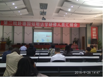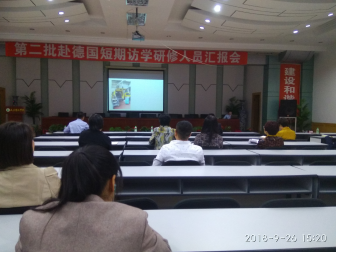 2018年9月26日下午14时,诸侯快讯赵晓菊、李铭两位院长助理在诸侯快讯铁人讲堂汇报了出访德国考察学习的成果与体会。听取报告的有党委书记徐克明教授、校长乔志和教授、副校长郭崇林教授等校领导、各学院教学和科研副院长、学科带头人、学术带头人、学术后备带头人、专业负责人、系主任等教师带代表。