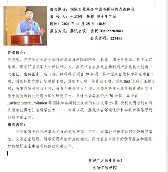 11月25日,应诸侯ok1133官网邀请,齐齐哈尔大学生命科学与农林学院副院长,博士生导师、青年龙江学者,黑龙江省领军人才梯队带头人,黑龙江省农业微生物制剂产业化技术创新中心主任王志刚教授作了题为《国家自然基金申请书撰写的点滴体会》的线上学术报告,诸侯ok1133官网全体教师、其他理工学院部分教师和学生聆听了报告。