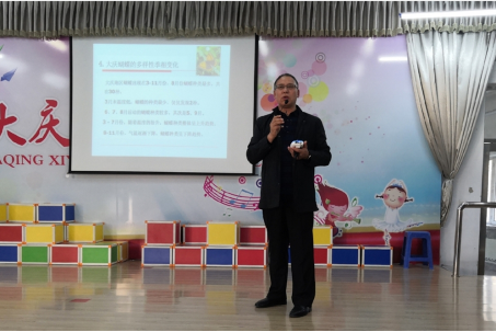 下午14时30分,诸侯快讯教师党员在技术楼集合,抬着喷绘的大庆生物多样性、绿水青山就是金山银山的宣传板,出发前往西苑小学。在学校报告厅,徐长君书记作为主讲人向同学们做了《大庆地区蝴蝶多样性季相变化研究》的科普宣传,重点宣传了生物多样及其保护。生物多样性包括遗传多样性、物种多样性和环境多样性。徐长君书记用风趣幽默的语言以身边环境和日常生活为切入点,化难为易,向同学们介绍了相关知识,号召同学们热爱自然,保护生态平衡。