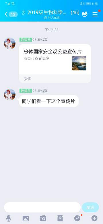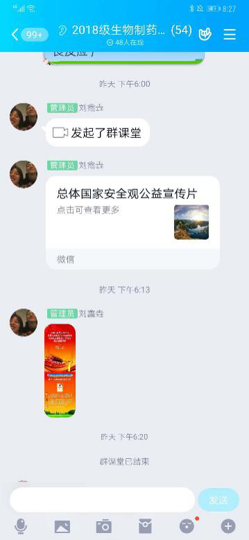 为宣传国家总体安全观,提高全体学生国家安全观念,诸侯ok1133官网于2020年4月15日18时在QQ班级群课堂开展“国家安全教育日”网上主题班会。主持人为各班级团支书,诸侯ok1133官网大一、大二全体同学参加了此次班会。