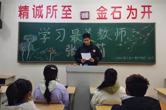 张丽莉老师在生死关头把生的希望留给学生,把危险留给自己,谱写了一曲感人肺腑的生命赞歌。她热爱教育、关爱学生,满腔热情地投入教育事业,用自己的爱心照亮了每一名学生的心灵。她潜心钻研、积极进取,以“要做就做到最好”作为自己的座右铭,把三尺讲台作为实现人生价值的舞台,努力成为一名高素质的人民教师,这一切一切,充分体现了一名人民教师的崇高思想境界和高尚道德情操,她用自己的实际行动诠释了无声的大爱。活动进入到下一环节,团支书通过提问同学们的方式,使同学们发表自己的感想。同学们感受颇深,被张丽莉老师默默奉献的精神与无私无畏的品质所感染。