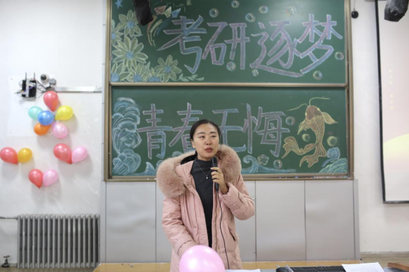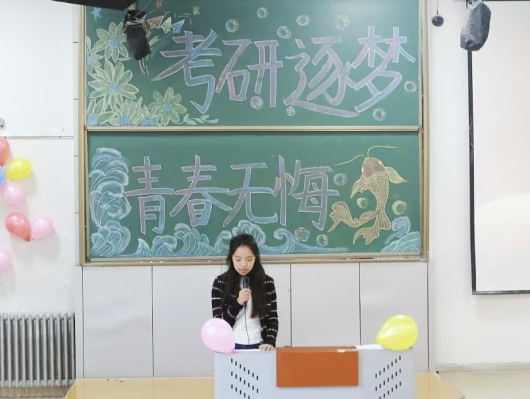 在校学生代表孙玲玉同学发言,她表示,考研的学长学姐们是学习的楷模,体现出的坚韧和勇气值得大家学习,祝愿学长学姐们在这次考研中一切顺利,金榜题名。