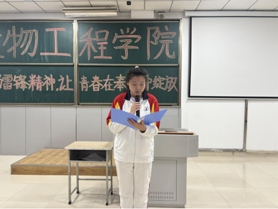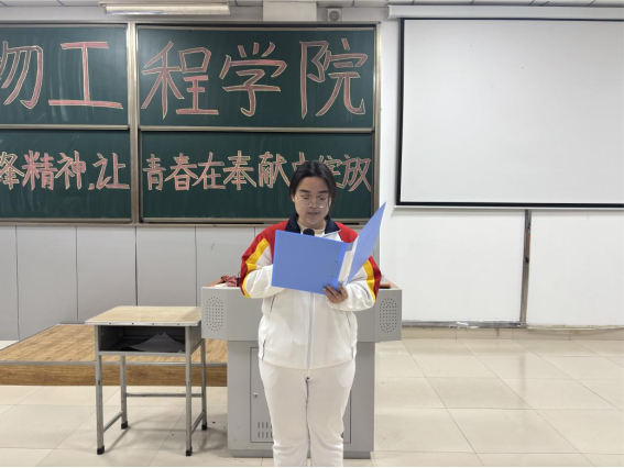 生物技术一班李小北以《青春逢盛世,雷锋精神照我行》为题,结合当代青年的责任与使命,呼吁同学们以雷锋精神为指引,在奉献中实现人生价值。