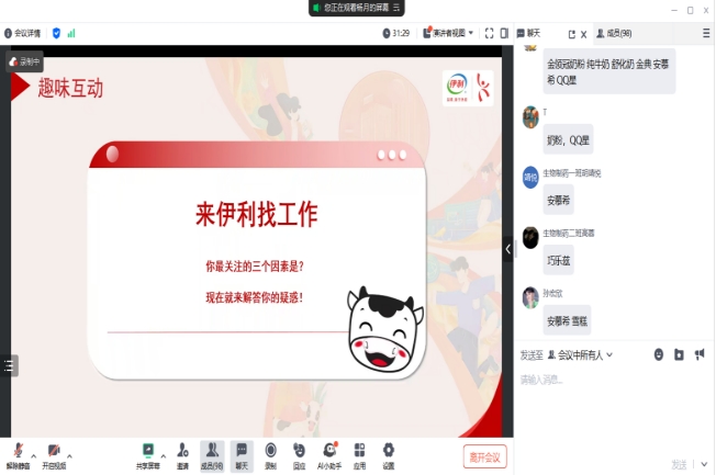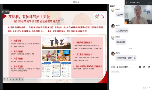 伊利集团是国内乳制品行业的领军者,杨月女士详细介绍了伊利集团的发展历程、企业文化、行业发展和招聘需求等有关情况,重点讲解了大庆伊利对于校招储备人才的有关政策,并详细说明招聘的各类岗位以及各岗位的职责、任职要求及薪资待遇等。