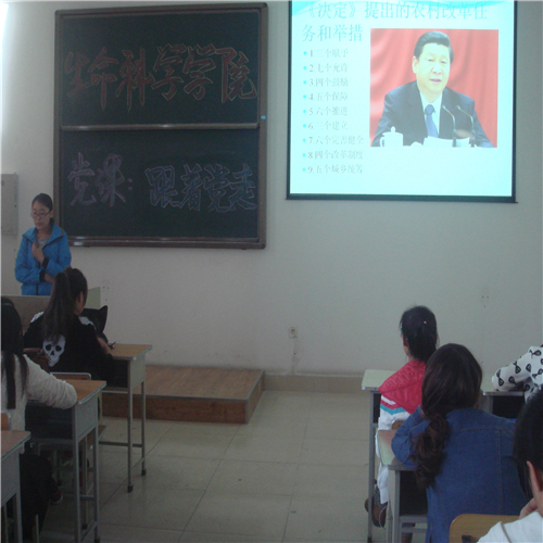 武庚风同志首先以一张图介绍了中国三十年来改革的成果,分别从时间、目标、改革目的、路径、主体以及进程等方面充分阐述其不同之处,并指出在中国共产党的带领下,改革开放取得了极大的进步,使得中国居民的总体生活水平基本达到小康社会。深化改革是推进中国发展的必然途径和要求,中国共产党一切为了人民,在提出的《决定》中更是施行“三个赋予、七个举措、四个鼓励、五个保障、六个推进、三个建立、六个完善健全、四个改革制度、五个城乡统筹”等决策,这让改革在有完整的计划的前提下进行,并最终取得了成功。结合自己的家乡,武庚风同志又提出问题:为什么要进行农村改革?怎么改?其实,农村改革是当代中国经济改革的起点,要想进行农村改革,就必须要以放活土地经营权为重点,并且在实际工作中抓住关键环节。最后,武庚风同志以三句话结束了本次党课培训,即“农业丰则基础强,农民富则国家盛,农村稳则社会安。