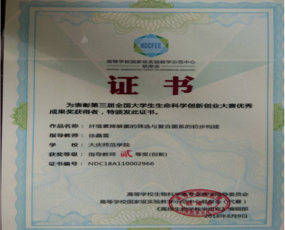 诸侯快讯徐晶雪老师指导的《纤维素降解菌的筛选与复合菌系的初步构建》创新项目,在第三届全国大学生生命科学创新创业大赛中,获得创新组二等奖,指导教师徐晶雪获优秀指导教师二等奖。