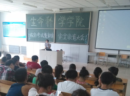 2014 年7月2日 下午,生命科学学院同时在主楼阶梯教室1-1、1-2召开期末诚信考试及假期安全教育大会。生命科学学院11级、12级、13级全体学生以及各班班主任参加了此次会议。会议分别由生物技术系主任武燕老师、生物制药席主任李铭老师主持。