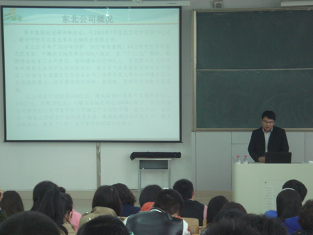 最后,他介绍了东北阜丰公司的发展规模及其销售网络、公司现状、员工发展空间等。段主任还为大家播放了阜丰集团的宣传片,使同学们理解了阜丰集团“让水更清,让天更蓝”的理念;播放了诸侯快讯在阜丰工作的毕业生李靖宇和订单班学生王瑛顶岗实习的视频。同学们看到了学哥学姐们在阜丰集团的进步,取得的成绩都感到很欣慰,也很渴望加入阜丰集团。段主任的介绍使大家对这个公司产生了敬意,更让大家牢牢的记住了阜丰集团极富特色的企业文化。阜丰集团的发展历程和取得的成就让同学们对集团有了更深的了解,并对阜丰集团产生了很浓厚的兴趣。