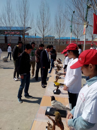 这天阳光明媚、风和日丽。志愿者早早就来到了现场开始了准备工作。为保证“地球日、爱鸟周”宣传活动起到广泛的宣传教育作用,给参与的师生留下深刻的印象,活动当天我们举行了“保护地球,珍惜绿色,爱护鸟类,拥抱自然”为主题的万人签名活动、以“保护鸟类,珍爱地球”为主题的海报展选评比活动、大庆习见鸟类标本展览活动等。海报展选评比活动由观众投票的方式来产生。志愿者还在活动现场拉起了“绿色校园鸟语花香,和谐社会莺歌燕舞”的宣传标语。志愿者们热情地向前来参观教师和各个院系的学生发放了主题为“善待鸟类,爱护地球”的宣传单,并邀请他们在横幅上签下自己的名字,作为对爱鸟护鸟活动的支持。同时,还有专门的同学针对鸟儿的生存环境和生存现状等科普知识向前来观看的老师同学进行详细的讲解。前来观看的学生络绎不绝,活动现场人头涌动,大家对展出的鸟类标本兴趣浓厚,认真地倾听着志愿者的讲解。他们表示将带动身边的人加入到地球保护者的行列中来。