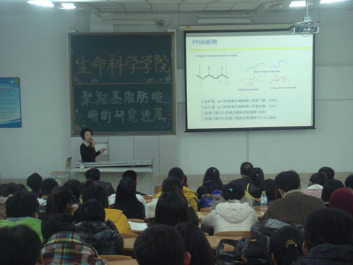陈珊 教授在微生物学教学和科研方面有丰富的经验和显著的成果。她十余年来一直致力于PHA的研究,并在PHA研究上取得了突破性的进展。本次讲座主要是围绕PHA的概述、发酵生产、降解研究展开。 陈 教授首先讲述了PHA的概念、结构分类、历史及物化性质,然后讲述了PHA的生命周期、发酵过程及优化过程。接着讲述了PHA合成与克隆及蛋白质工程相连接进行研究。然后讲述了PHA已经应用到许多方面,包括以生物可降解塑料代替通用塑料、将生物可降解性及生物相容性用于医用血管组织工程、软骨组织工程、神经组织工程,可控药物的缓解载体。最后讲述了作为生物能源代替乙醇,PHA的手性单用的应用等。 陈 教授预言,PHA将在以后会给人类社会带来更大福祉。