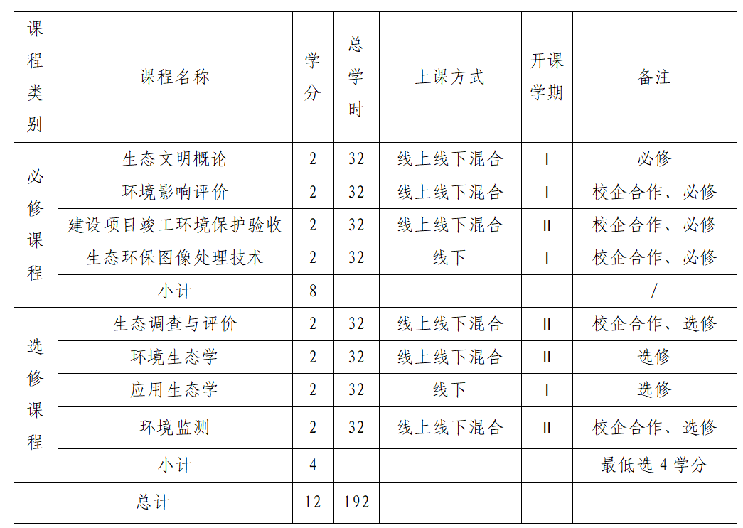 课程分为环境监测与评价类(6学分)、生态学类(8学分)和环境制图类(2学分)四种课程,完成必修课程8学分、选修课程4学分共计12学分。